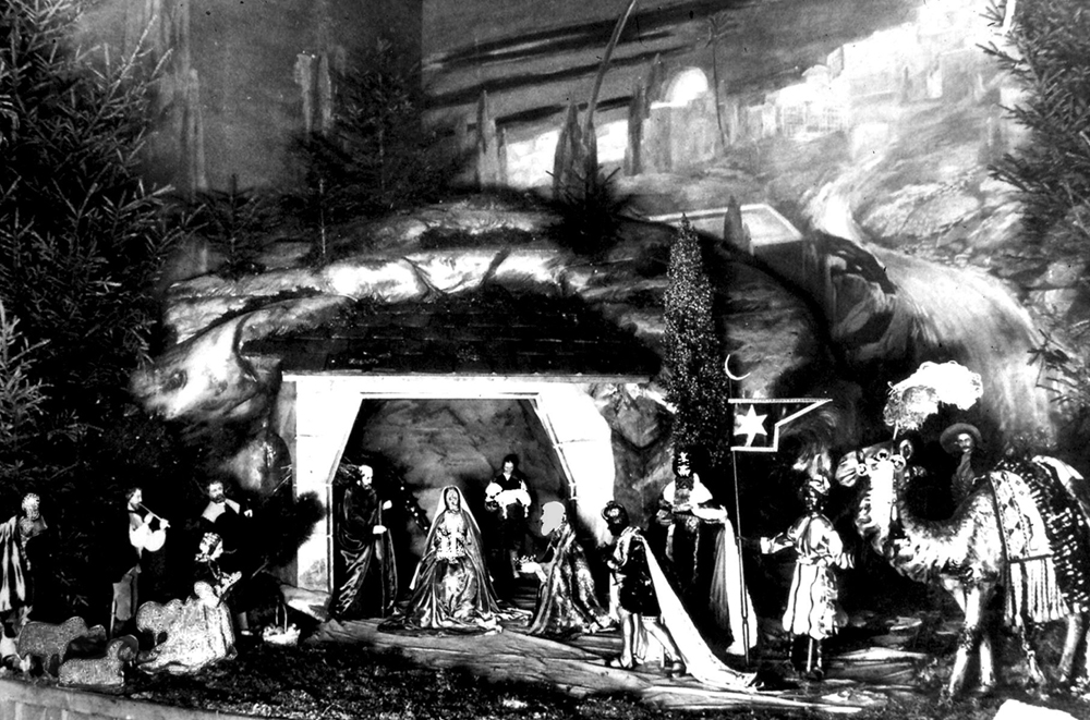 Die Oelder St.-Johannes-Kirche besitzt eine sehr schöne alte Krippe. Wegen Bauarbeiten fehlt sie in diesem Jahr in der Kirche. Um das Wunderwerk jedoch anschauen zu können, ist sie hier in unterschiedlichen Szenen zu sehen. Maria und Joseph müssen sich laut Gesetz in Steuerlisten eintragen lassen. Also reisen sie per Esel von Nazareth nach Bethlehem. Maria ist schwanger, und das Paar braucht unbedingt eine Herberge. Doch die findet sich nicht, wohl eine Krippe in einem Stall bei Ochs und Esel. Statt der Engel, die die Geburt begleiteten, sind es nun die „Heiligen Drei Könige“, Weise aus dem Morgenland, die das neugeborene Kind besuchen. Das Foto entstand in den 1930er Jahren, als die Krippe in St. Johannes erstmals die Besucher erfreute.